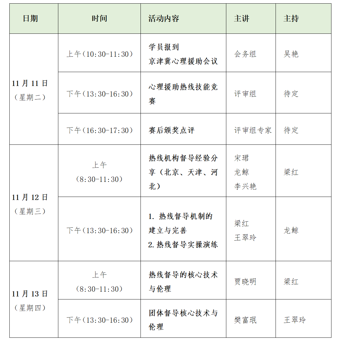 为全面提升心理援助热线的专业化服务水平,系统解决当前热线工作中面临的实际挑战,兹定于2025年11月举办“2025年心理援助热线技能竞赛与督导培训”。本次培训将通过三个关键环节实现能力提升与体系建设:首先,依托技能竞赛这一实践平台,重点强化咨询师在危机干预、情绪疏导等核心场景中的实战能力;其次,通过系统的督导机制课程与实操训练,帮助参训单位建立规范的督导支持体系,有效保障咨询师的专业成长与心理健康;同时,培训将搭建专业的交流平台,促进不同机构间的经验共享与资源整合。本次培训旨在通过上述举措,整体提升心理援助服务的质量水准,推动行业向更加规范化、专业化的方向发展。现将有关事宜通知如下: