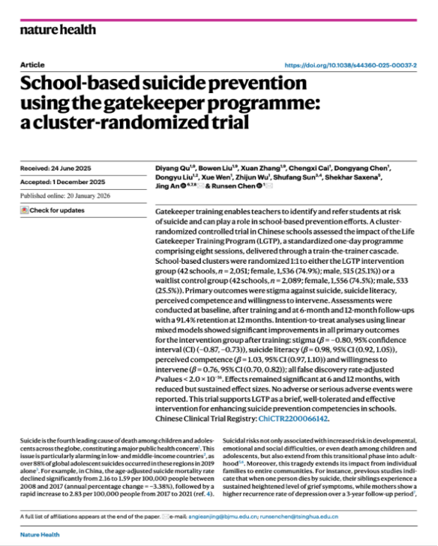 科研动态 | 北京心理危机研究与干预中心联合清华大学团队在《Nature Health》发表重要研究成果:推动校园自杀预防科学化与系统化