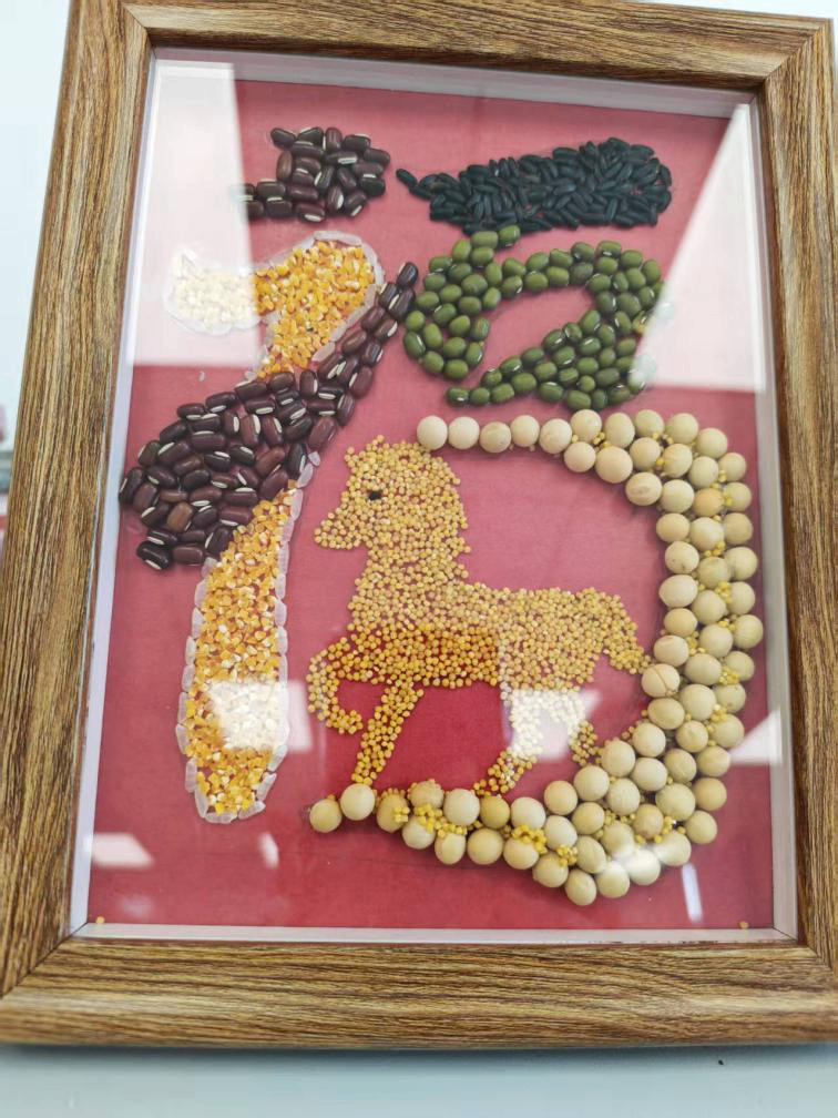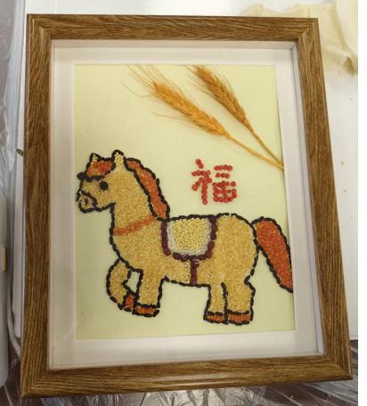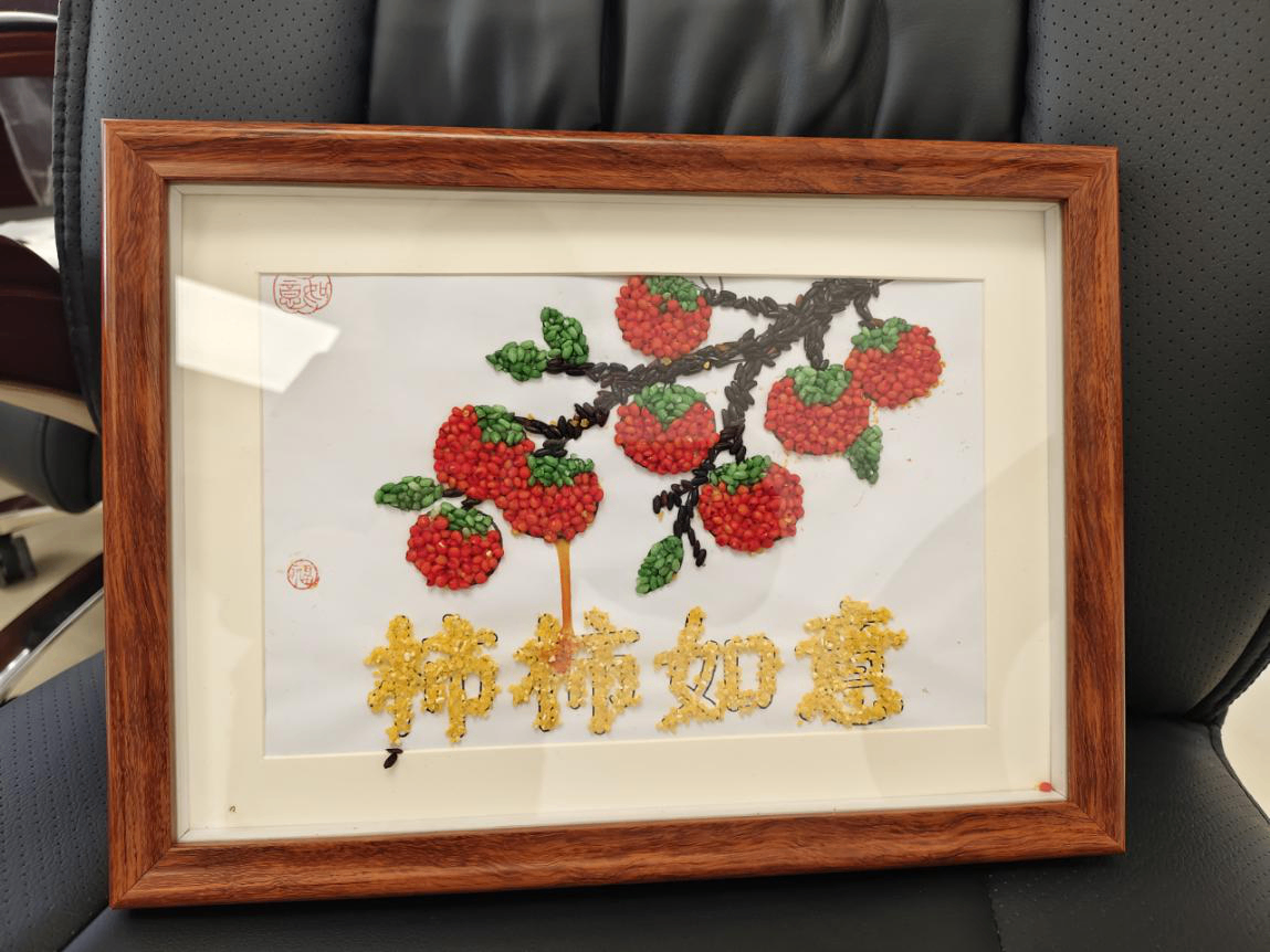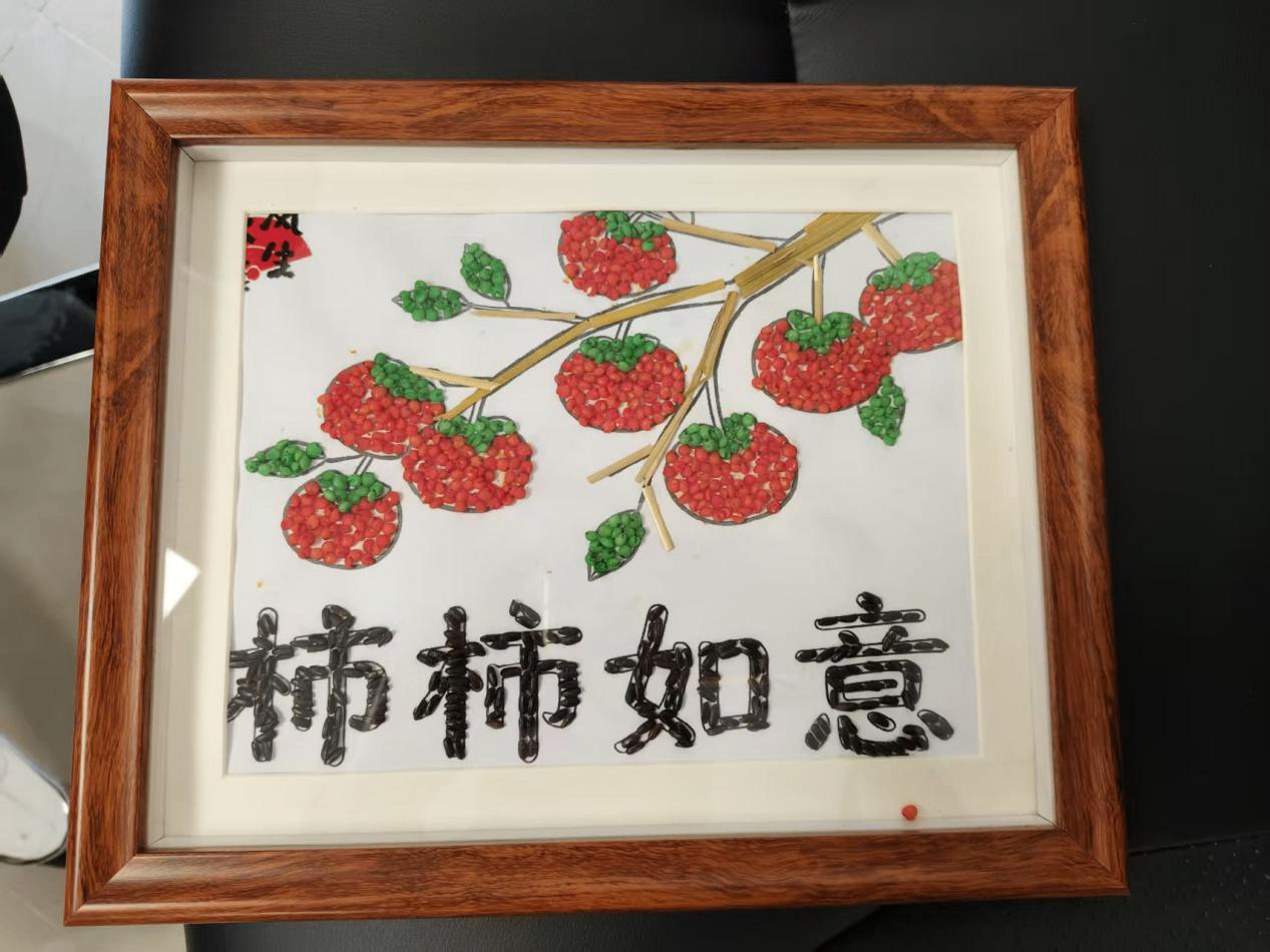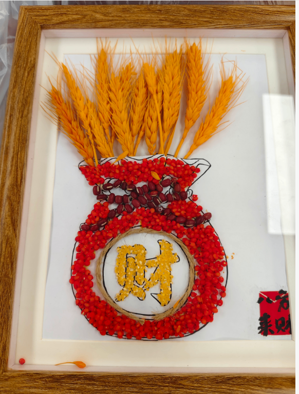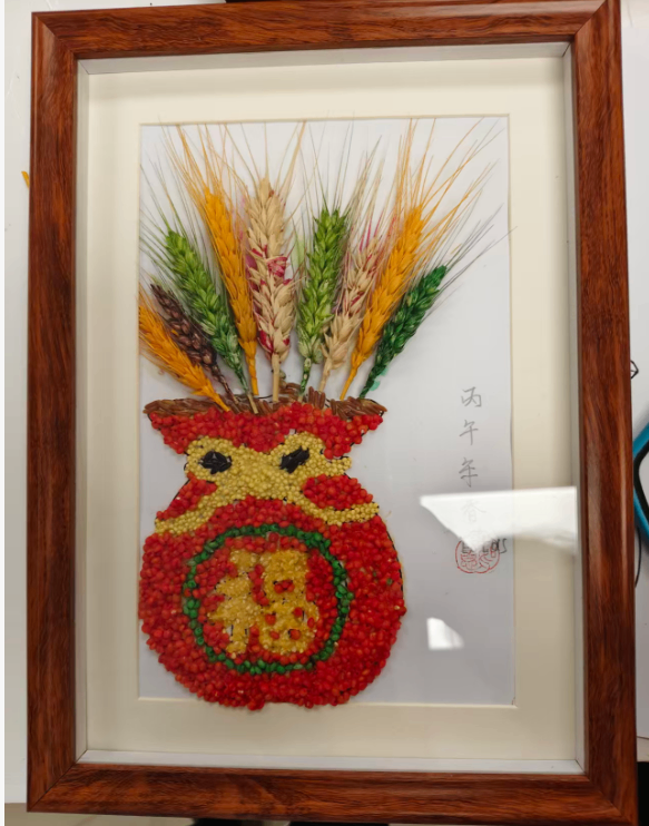 大家围坐桌前,指尖轻捻五谷,在一粘一贴之间,感受土地的馈赠与生活的丰盈,将“马上有福”、“穗穗平安”、“杮杮如意”等祝福,一点点铺成独属于自己的新春画作。