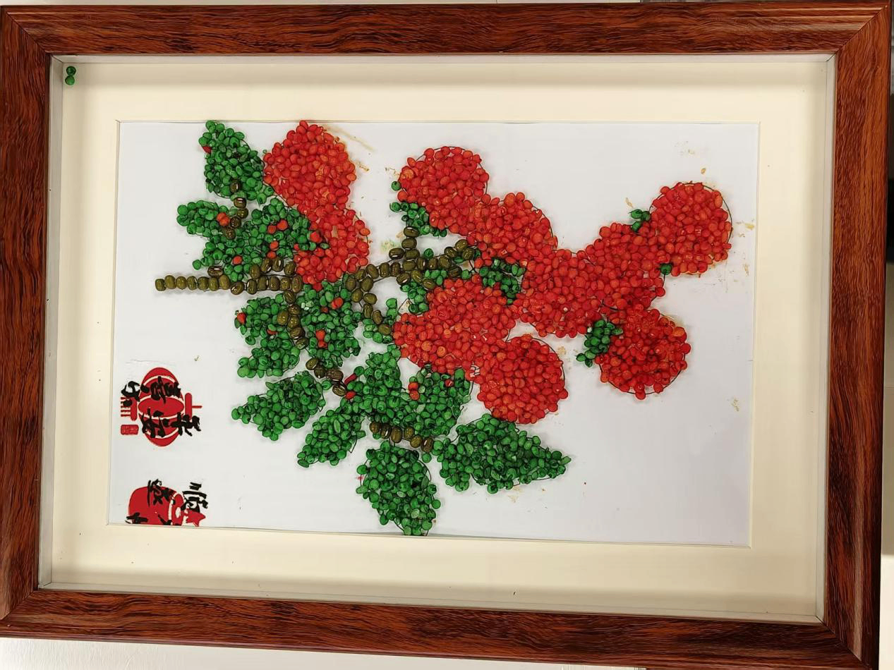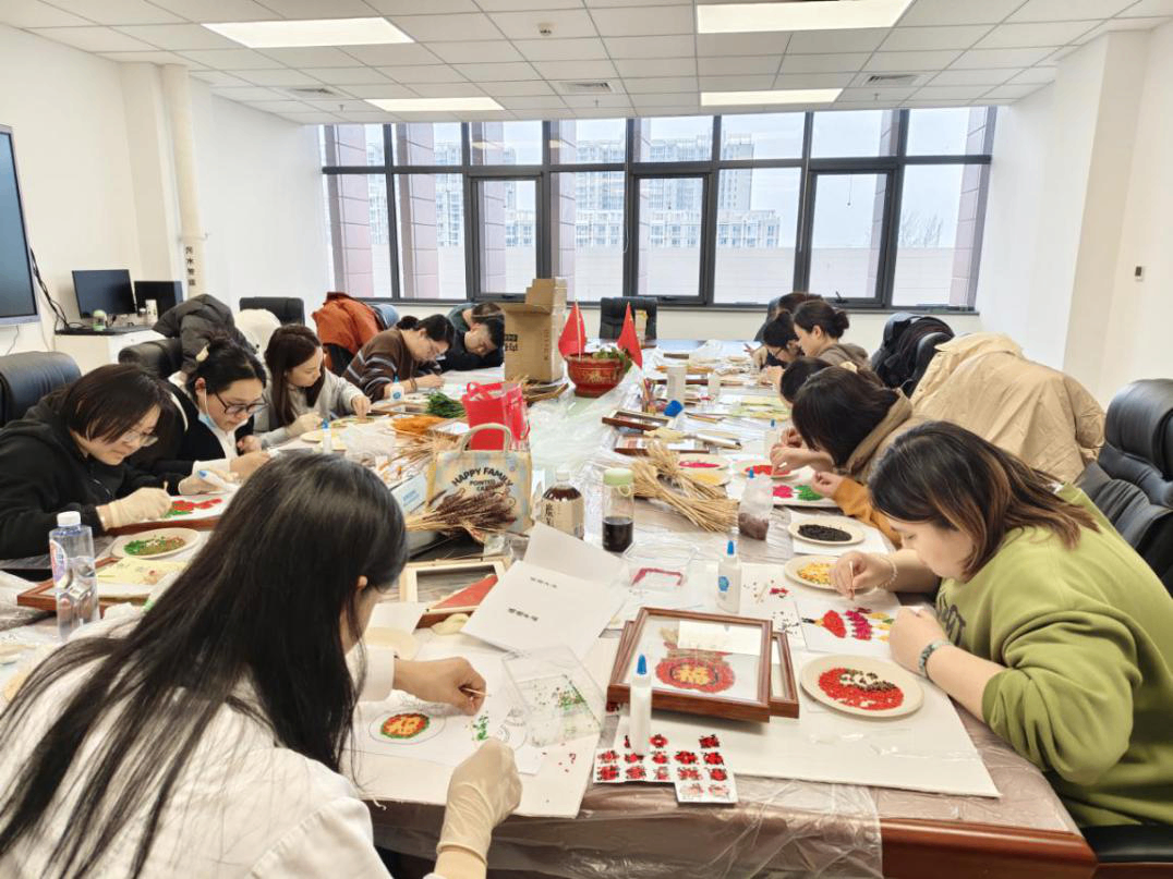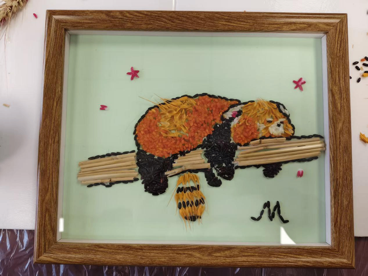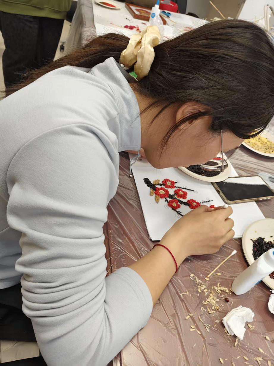 大家围坐桌前,指尖轻捻五谷,在一粘一贴之间,感受土地的馈赠与生活的丰盈,将“马上有福”、“穗穗平安”、“杮杮如意”等祝福,一点点铺成独属于自己的新春画作。